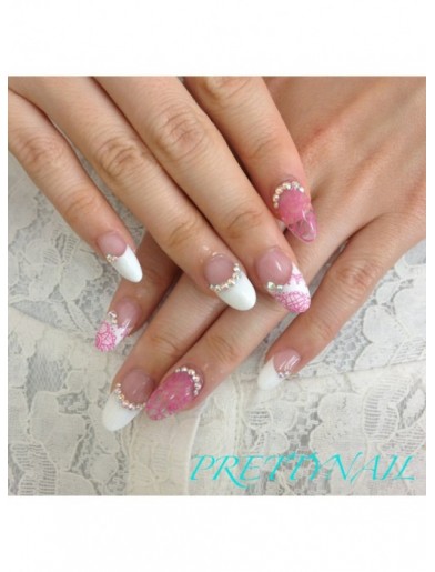 ピンクフレンチに白レースネイル さえちゃ ネイルサロン Raju ラジュ のネイル ネイルクルー